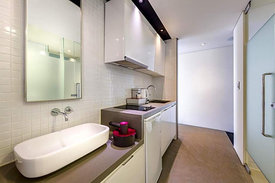 This spacious studio features modern interior with floor-to-ceiling windows, a floor, a private terrace. Amenities include a free mini-bar, flat-screen TV, a kitchenette and free wired internet. This room type comes with Esthederm Spa 20% discount.